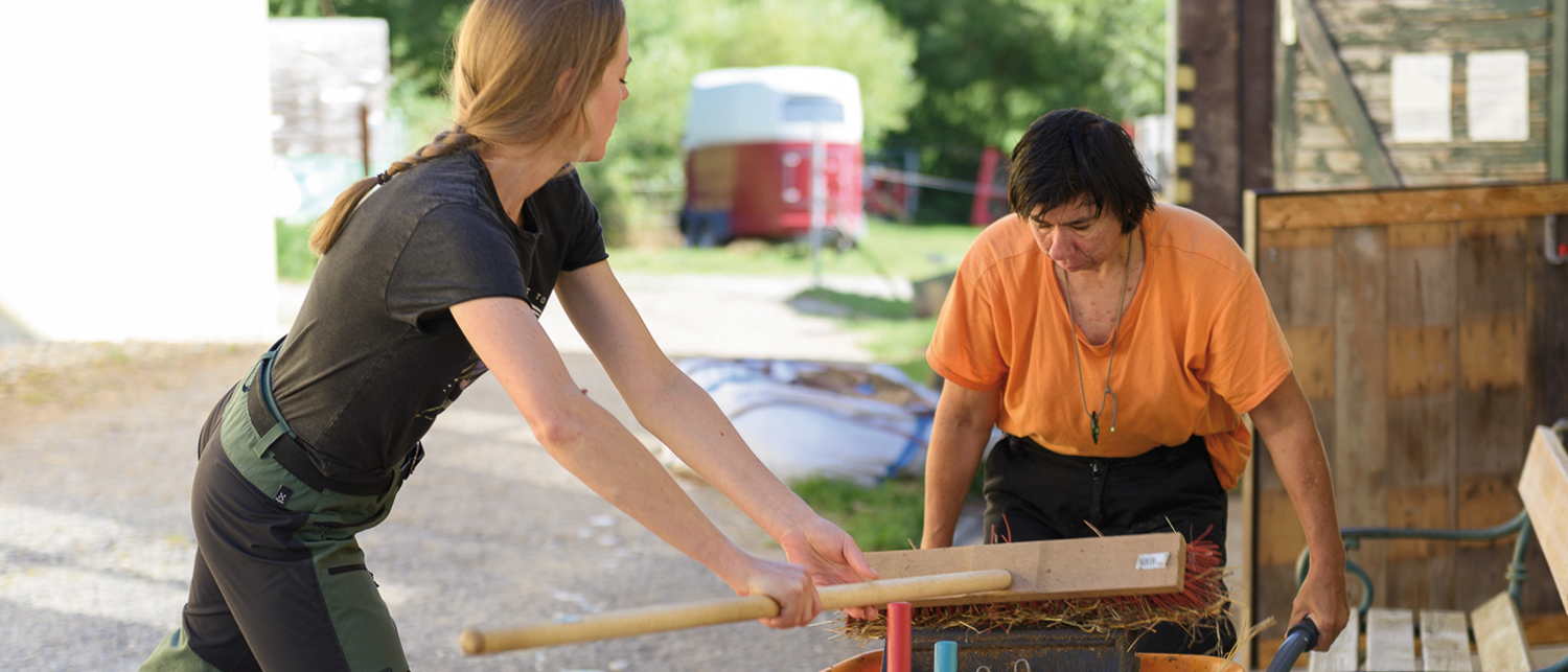 Unsere Tätigkeiten auf dem Bauernhof sind vielfältig. Menschen mit Behinderung übernehmen unter Anleitung die Versorgung der Tiere, Stallarbeit, Bio-Gartenbau und die Pflege des Areals. Gemeinsam mit Familie Passet wird geerntet und verarbeitet. Dadurch wird Inklusion lebendig und gelebt. Jede:r hat auf dem Hof facettenreiche Möglichkeiten, um in und mit der Natur zu arbeiten.